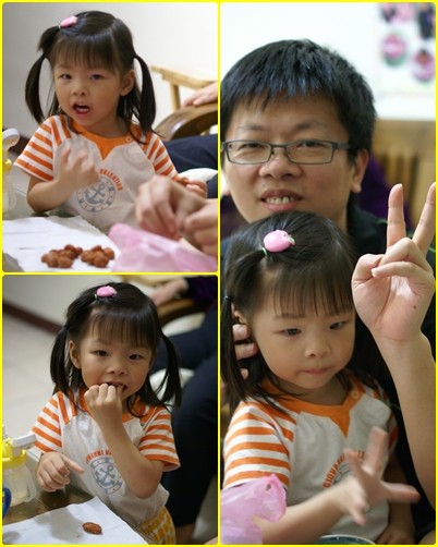 然後雙蛋會趁阿娘在廚房作戰的時候,拿餅乾請阿祖開....等阿娘端菜至客廳時,會發現餅乾屑屑掛在這3個傢伙的嘴邊....。據阿祖的說法,說是我叫他們拿企請祖祖開滴,可惱。